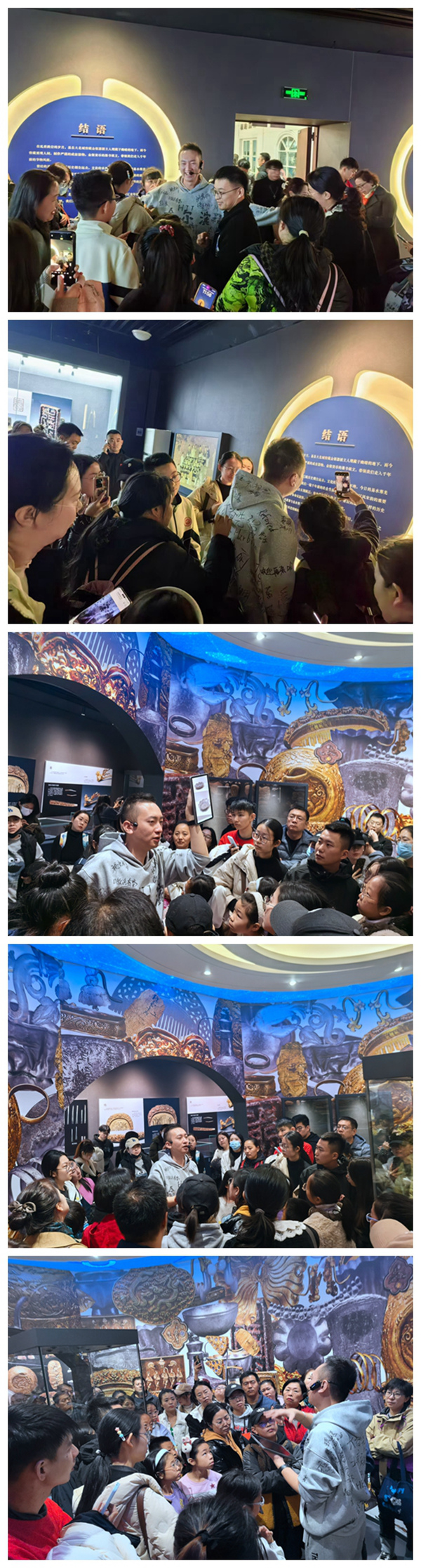 在讲解现场,展厅人头攒动,百余名观众屏息凝神,静静聆听全国博物馆讲解员大赛志愿组第一名董臻的讲解。在董臻声情并茂地讲解中,观众的思路也随之穿越千年。他的讲解内容从探寻窖藏主人的身份开始,引导观众从文物细节入手,抽丝剥茧,一起发现、分析、遐想。随着其细致入微的讲解,观众们驻足于一件件展品前,仔细观察文物的器形、纹饰、铭文、押花,认真寻找破解窖藏主人身份谜团的线索。一场持续80分钟的讲解结束,现场观众意犹未尽,久久不愿离去。