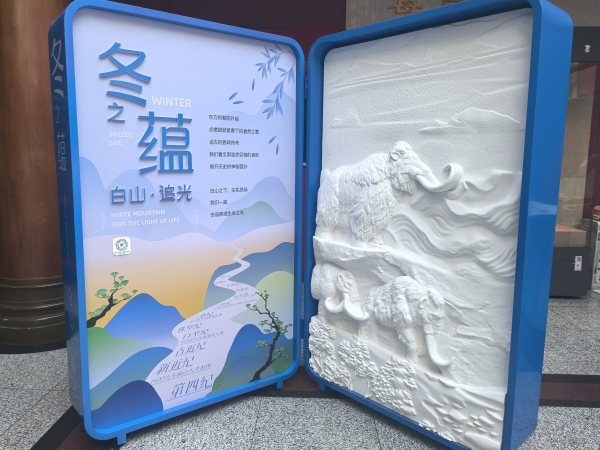 巡展采用旅行箱展陈方式,融入冬季的冰雪元素,充分展现龙江的冰雪魅力。在本次巡展中,设计了以披毛犀与猛犸象打破时空之门为线索,分为“冬之蕴——白山·追光”、“冬之韵——黑水·循声”和“冬之运——沃土·逐迹”三大板块。其中,“冬之蕴”通过浮雕讲述龙江史前生物生存情况,探索史前生态;“冬之韵”采用互动形式,展示文物数字化保护成果及黑龙江先民文化,并利用“冰晶”展现历史之美;“冬之运”则展现龙江冰雪运动特色,首创冬季运动新闻BOX,展现冰雪运动发展及成就,为亚冬会预热。整个展览以时间为线索,从古至今展现龙江远古生物、古代文明及现代冰雪运动,让参观者在了解自然、历史知识的同时,感受冰雪的纯洁与浪漫。