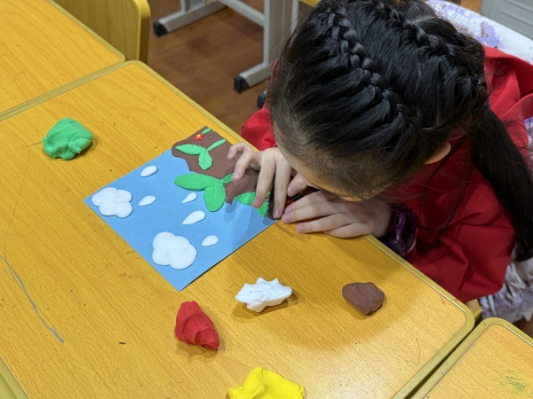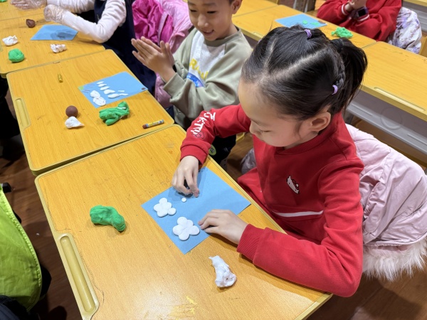 尽管窗外寒意犹存,但同学们的热情高涨,在老师的带领下,大家一起学习雨水节气知识,并使用轻粘土、蜡笔、卡纸等材料绘制出一幅幅充满创意的雨水主题画作,将心中对雨水节气的美好想象呈现在纸面上。
