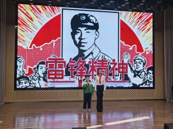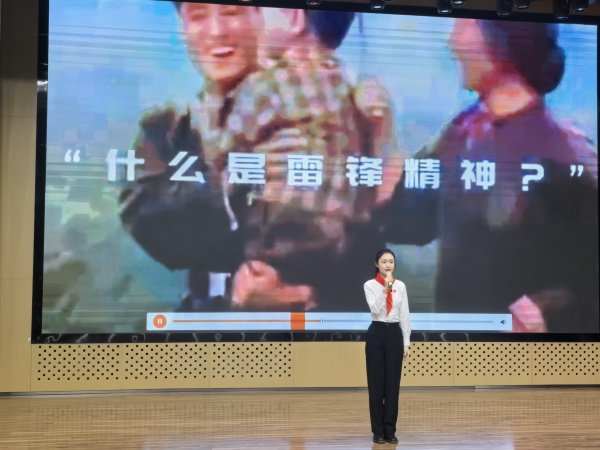 视频背景展示播放了一系列与雷锋相关的珍贵图片和影视资料,生动地再现了雷锋平凡而伟大的一生。学生代表及博物馆讲解员共同登台,用真挚的声音、情感以及生动形象的肢体语言,为同学们讲述了雷锋从悲惨的苦难童年到成长为一名全心全意为人民服务的解放军战士的光辉历程。通过一个个真实感人的小故事,如雷锋雨夜送大嫂回家、利用休息时间帮战友洗衣服、省吃俭用捐款救灾等,让同学们深刻感受到了雷锋助人为乐、无私奉献的高尚品质。在讲解过程中,还穿插展示了一些情景,增强了故事的吸引力和感染力。课堂活动打破了传统思政教育的枯燥模式,以生动有趣的故事为载体,让同学们深刻了解雷锋同志日常生活中所发挥的螺丝钉精神和无私助人的感人事迹,提升大家对雷锋精神的深刻认知,仿佛穿越时空,让同学们走进了雷锋的世界。作为观众的同学们不禁潸然泪下,对雷锋的崇敬和对奉献精神有了更深刻的理解,台下不时响起热烈的掌声。