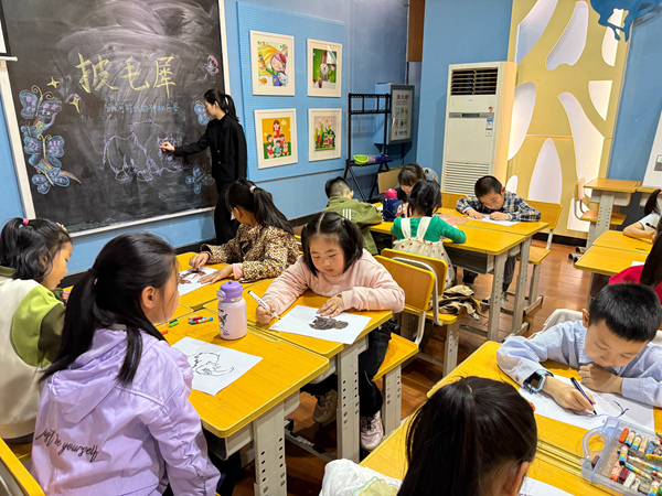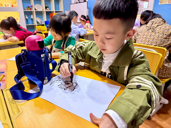 老师带领大家由省博物馆“镇馆之宝”之一——披毛犀化石出发。通过披毛犀标本图片的展示,同学们在老师的讲解下被犀牛威猛的形象所吸引,同时也让大家对犀牛大家族充满了好奇。同学们走进犀牛家族,了解犀牛、白犀、苏门答腊犀、黑犀的习性特点,分析披毛犀灭绝的原因。课程的最后是绘画时间,同学们纷纷开动画笔,绘画卡通版的披毛犀。