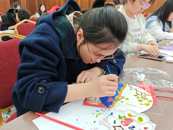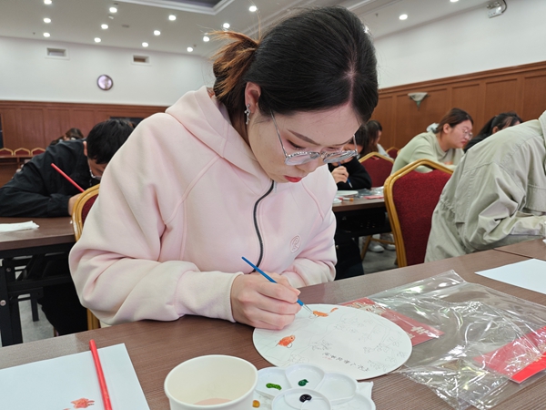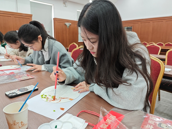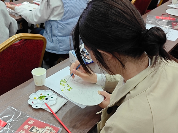 本次活动以“镜映山水·扇韵青春”为主题,特别选取黑龙江省博物馆藏国家一级文物“金代山水人物故事镜”作为灵感源泉。这枚金代铜镜距今近千年,镜背上农夫耕作、官员议事与双鱼嬉戏的图案,不仅展现了金代对农业的重视,更寄托了女真族对人口繁盛的美好祈愿。讲解员刘芳担纲主讲,她以深入浅出的方式,为学员们娓娓道来铜镜背后的历史故事与文化内涵,带领大家穿越千年时光,探寻文物深处的时代印记。在汪晴老师的指导下,学员们以手工团扇为载体,融入金代文化元素,亲手打造独一无二的艺术作品。活动中青年志愿者积极参与互动、认真绘制作品。