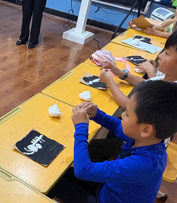 课程围绕松花江猛犸象展开,系统讲述了这些史前巨兽在冰河时代的生存环境、生活习性,以及它们从繁盛走向灭绝的历程。小朋友们全神贯注,眼神中满是对远古生命的好奇与探索的渴望,大家仿佛坐上了时光机,穿梭回万年前与猛犸象“面对面”。