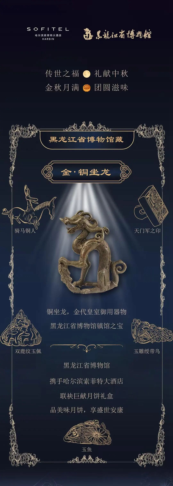 “但愿人长久,千里共婵娟。”中秋将至,在这个承载着团圆美满寓意的传统节日里,黑龙江省博物馆(以下简称“龙博”)与哈尔滨索菲特大酒店跨界携手,共同推出独具特色的中秋月饼礼盒。这不仅为市民的中秋团圆增添了浓厚的文化氛围,更成功实现了文化价值与节日经济的“1 + 1>2”效应。