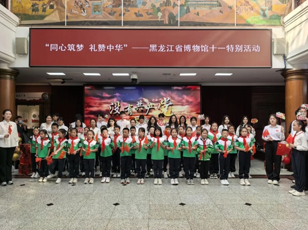 10月1日,“同心筑梦 礼赞中华”活动在省博阳光大厅掀起爱国热潮。大学生志愿者与小学生携手,通过情境朗诵、红色歌舞和趣味互动,带领观众重温峥嵘岁月;10月6日,“月映黑土 韵满龙江”中秋主题活动融合投壶、飞花令等传统雅戏,并特别融入赫哲族、鄂伦春族等北方四小民族文化元素,小小讲解员与观众共唱《但愿人长久》,传递团圆与家国一体的人文精神。
