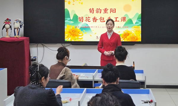 重阳节当日,黑龙江省老干部大学一楼教室内暖意融融,“菊韵重阳·菊花香包手工体验”在此温馨启幕。20位乐龄学员围坐桌前,桌上整齐摆放着剪裁好的布料、棉线与菊花香料。“重阳节佩菊囊,是老祖宗传下来的祈福智慧,今天咱们亲手把这份健康顺遂的心意缝进去!”随着工作人员的讲解,学员们纷纷拿起针线,穿针引线间尽显专注。有的学员手法娴熟,指尖翻飞间,布料已初步勾勒出轮廓;有的学员虽略显生疏,却在邻里伙伴的互助指导下慢慢找到节奏,“你这针脚得再密点,香包才结实”“这个弧度可以再调整下”,不时响起轻声交流的话语,夹杂着阵阵爽朗的笑声。