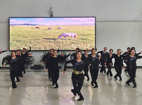 伴随着悠扬的乐曲,黑龙江省老干部大学2025年秋民族舞中级班的学员们身着蒙古服饰登台,带来大气磅礴的蒙古舞《我的草原》,豪迈的舞姿、灵动的步伐瞬间点燃现场气氛,台下掌声与喝彩声此起彼伏。正式拉开了“菊韵重阳”互动演出的序幕。