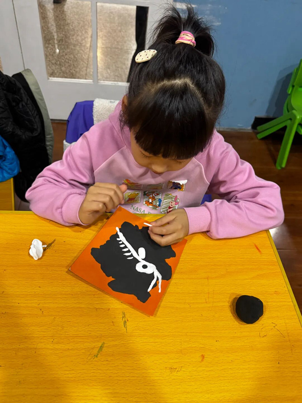 到了课程尾声,小朋友们拿起卡纸和轻粘土,为猛犸象“穿上新衣”。他们充分发挥想象力,使用轻粘土制作史前巨兽的化石骨架,为它们勾勒出冰河时代的奇幻背景。一幅幅充满童趣的画作,展现了孩子们对这种远古生物的独特理解与丰富创意。