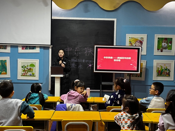 课前,老师通过互动问答环节,吸引了孩子们争先恐后做出回答,同时也引出了本节课的主题——中东铁路。老师先后从中东铁路的历史、建设目的以及铁路情况等方面进行介绍。