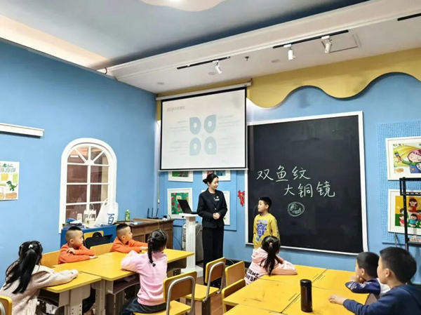 课堂教学循序渐进、层层深入,充分贴合儿童认知与学习特点。在文物赏析环节,孩子们跟随授课老师走入展厅,近距离细致观察铜镜的整体造型、双鱼灵动姿态与水波纹路,系统学习传统对称构图法则、经典纹样寓意等传统文化知识,直观感受古代青铜工艺的精湛与传统美学的韵味。