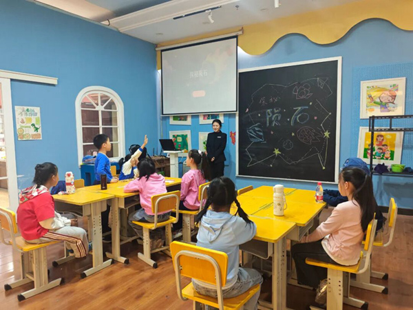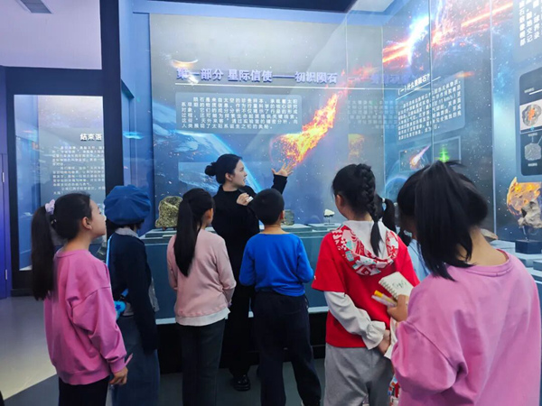 课堂上,老师围绕陨石的起源、形成与分类等科普知识展开细致讲解,用生动有趣的语言揭开天外来客的神秘面纱。在陨石标本参观环节,同学们近距离触摸陨石,直观感受来自宇宙的独特质感与岁月痕迹;趣味互动与现场问答,让科普知识不再枯燥,充分调动起大家的参与热情。